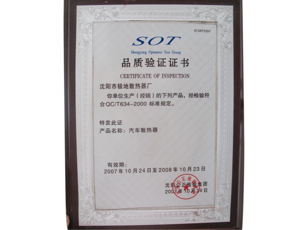 证书编号: 001 证书名称: 品质验证证书 发证机构: 沈阳公正检验集团 生效日期: 2007年10月24日 截止日期: 2008年10月24日 认证简介: 沈阳市极地散热器厂